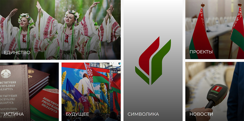 Кроме того, здесь представлена утвержденная партийная символика. Эмблема БП «Белая Русь» представляет собой факел с красно-зелеными лепестками пламени, где факел символизирует стремления к знаниям, просвещению, прогрессу, а огонь – это символ возрождения, единства прошлого, настоящего и будущего. При этом «факел победителя (наше дело правое) состоит из трех лепестков пламени, которые символизируют единство народа, государства и Президента». А в целом образ эмблемы «отражает стремление партии к стабильности, горению во имя Родины, поступательному движению в будущее».
