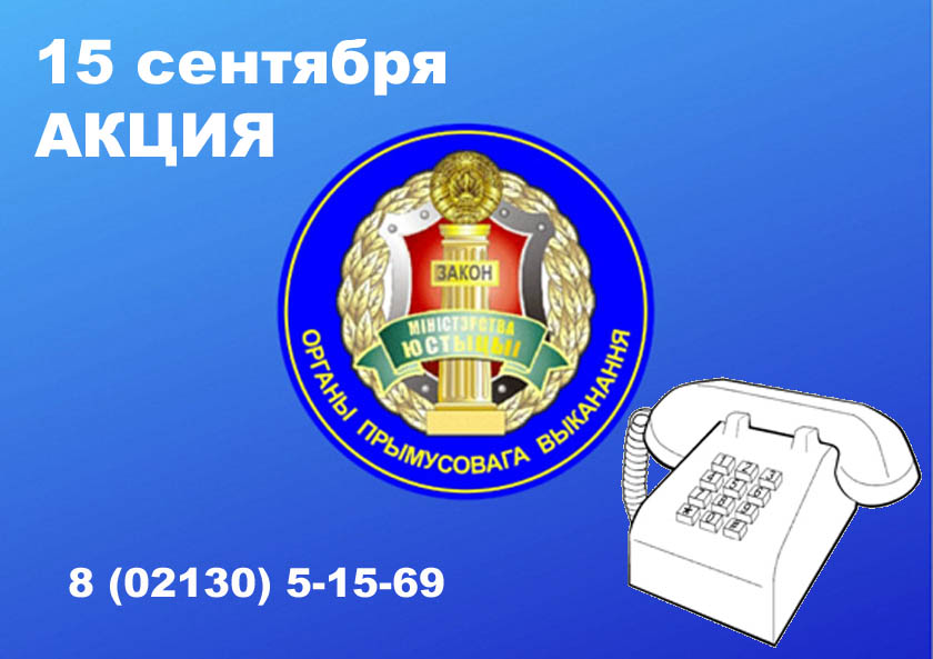 15 сентября 2023 года с 11.00 до 13.00 отдел принудительного исполнения Шумилинского района проводит благотворительную акцию приуроченную ко Дню народного единства Витебской области, по бесплатному консультированию граждан в дистанционном режиме посредством «прямой телефонной линии», включающую вопросы по деятельности отдела принудительного исполнения Шумилинского района в рамках принудительного исполнения судебных постановлений и иных исполнительных документов.