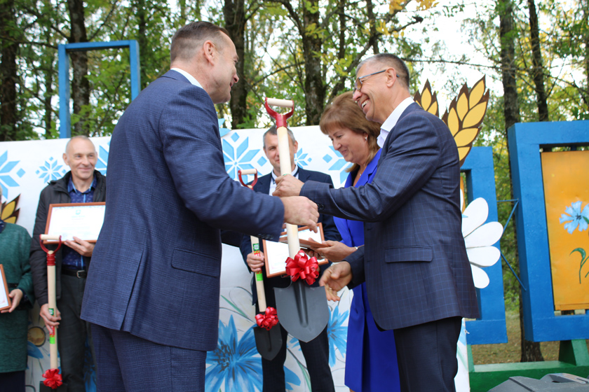 Афіцыйная частка ўзнагароджання лепшых на жніве‑2023 праходзіла на галоўнай сцэне ля сельскага клуба. Каравай з зерня новага ўраджаю – сімвал дабрабыту і жыцця – уручылі кіраўніку раёна Сяргею Галынчыку. Ён павіншаваў усіх са святам хлебаробаў, выказаў словы шчырай удзячнасці тым, хто душу, веды, намаганні і сілы ўклаў у вельмі нялёгкую справу вырошчвання хлеба, тым больш, што сёлетні год быў вельмі няпростым для сельскіх працаўнікоў. І сёння работы не скончаны – закладваецца фундамент будучага ўраджаю, засяваюцца азімыя зерневыя. Яшчэ многа ў аграрыяў работы па нарыхтоўцы кармоў, уздыме зябліва.