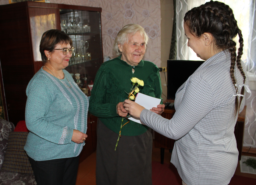 16 кастрычніка загадчыца аддзялення сацыяльнай дапамогі на даму ТЦСАН Аксана Аўчыннікава і інспектар па асноўнай дзейнасці цэнтра Марыя Осіпава адправіліся па населеных пунктах раёна з пачэснай місіяй – павіншаваць падапечных цэнтра з 85-гадовымі юбілеямі. Адметна, што два юбіляры – Ніна Васільеўна Маруцька і Надзея Сямёнаўна Маркіянава – нарадзіліся ў Дзень маці.