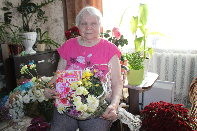 Напачатку накіраваліся да абальчанкі Ніны Васільеўны Маруцька. Жанчына ўсё жыццё жыве ў Обалі, спачатку працавала на торфапрадпрыемстве імя Даўмана, затым – швачкай у цэху КІМ. На яе вачах набываў новы выгляд родны пасёлак. «Памятаю, як узводзіліся новыя шматпавярховыя дамы, – расказвае яна. – Спачатку была школа драўляная, і знаходзілася ў мікрараёне торфапрадпрыемства, туды я пайшла ў першы клас. Затым школа была каля сённяшняга музея, нас, вучняў, праз раку на лодцы перавозілі». Разам з мужам выхавалі двух дачок, адна зараз жыве ў Наваполацку, другая – у Маскве. Асаблівая радасць для Ніны Васільеўны, калі да яе прыязджаюць яе чатыры унукі і пяць праўнукаў. На юбілей прыехалі практычна ўсе родныя. У панядзелак яе кватэра патанала ў кветках.