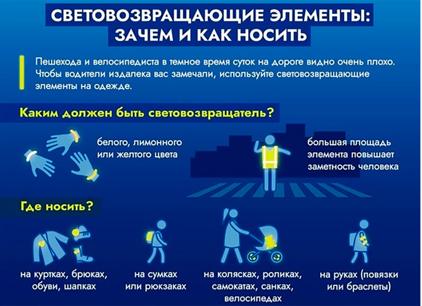 – Згодна з патрабаваннямі Правілаў дарож-нага руху пры руху па краі праезнай часткі дарогі ці ўзбочыны ў цёмны час сутак пешаход павінен пазначыць сябе святловяртальнымі элементамі (пажадана з двух бакоў, наперадзе і ззаду). Гэта патрабаванне арт.17.1 ПДД распаўсюджваецца на ўсіх пешаходаў, незалежна ад таго, загарадная гэта дарога ці гарадская.