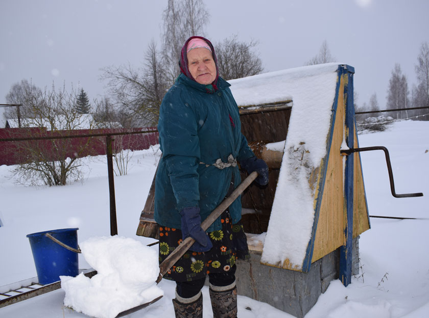 – Іду расчышчаць снег ля калодзежа! – сказала Таццяна Іванаўна Зайцава з Обалі, якую сустрэлі ля веснічак з вядром і рыдлёўкай у руках. – Завіруха і снегапады нас не пакідаюць, прыходзіцца расчышчацца кожны дзень.