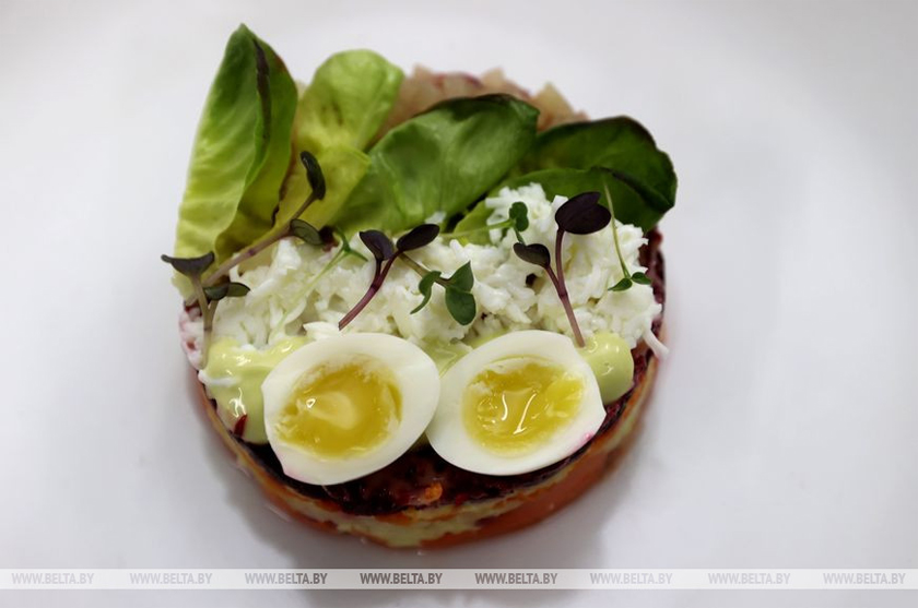 Новогодний стол — лидер по разнообразным блюдам, где зачастую хозяйки игнорируют калории, сочетание белков, жиров и углеводов, а на первый план выносят вкусовые качества. Оливье, сельдь под шубой, холодец, салатики с майонезом, пироги и пирожки, соленья, маринады, бутерброды, мясные и сырные нарезки — и торт, как венец праздничного застолья. Кулинарные традиции в некоторых семьях кочуют из поколения в поколение. Однако представители не большой, но профессиональной кухни предлагают внести новые оттенки вкуса и аромата в знакомые яства. Мастера производственного обучения Витебского государственного индустриального колледжа Егор Окунев и Алена Полесова рассказали корреспонденту БЕЛТА, как можно даже давно укоренившееся в новогоднем меню блюдо подать под новым соусом, а также подарить в качестве необычного вкусного презента.