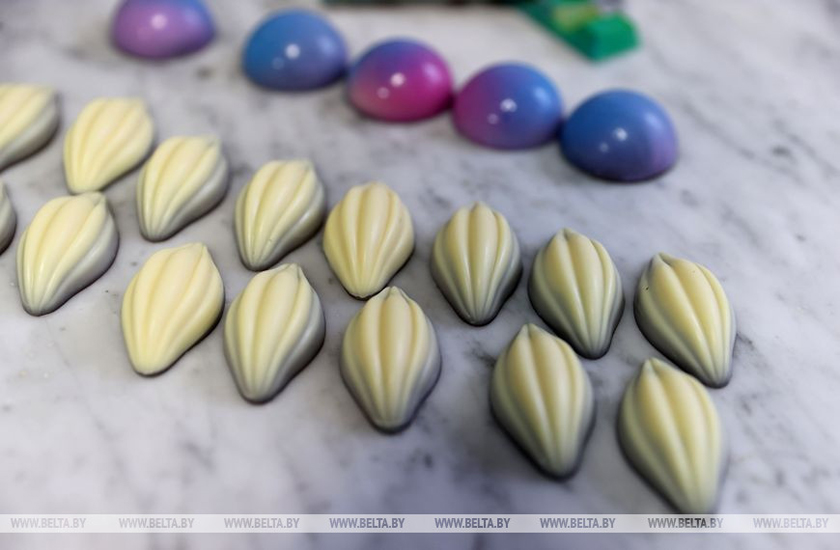 «В работе я использую итальянский и бельгийский шоколад, которые считаются лучшими, но в домашних условиях и для экономии можно использовать наш белорусский — он доступный и податливый в процессе приготовления. Можно брать как горький, так и молочный. Формочки для конфет можно использовать силиконовые или поликарбонатные. Самый главный инструмент при работе с шоколадом — это пирометр или контактный термометр, потому что шоколад нужно темперировать. Для темного шоколада рабочей считается температура в 31-32 градуса по Цельсию, белого — 30, молочного — 29-30. Это нужно для того, чтобы шоколад не стекал по рукам, правильно застывал и потом хрустел в готовых конфетах», — пояснила кондитер.