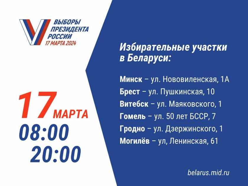 17 марта 2024 года состоятся выборы Президента Российской Федерации. Участие в них смогут принять граждане России, постоянно проживающие или временно находящиеся в Республике Беларусь. Для проведения голосования в Витебске образован избирательный участок по адресу ул. Маяковского, 1 (здание Центра культуры «Витебск»).