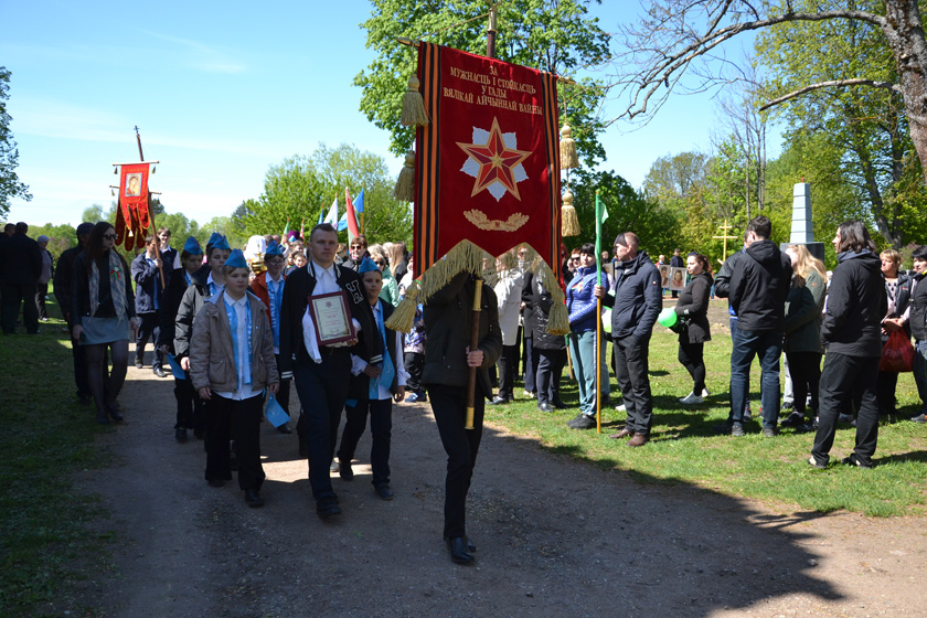 Старшыня Обальскага сельвыканкама Сяргей Мураўёў павіншаваў землякоў з Днём Перамогі і перадаў грамату і вымпел загадчыку музея Обальскага камсамольскага падполля Юрыю Хаданёнку. Перад тым, як узнагарода ўрачыста трапіла ў музей на захоўванне, настаяцель храма Ануфрыя Вялікага Уладзімір Пучынскі асвяціў вымпел.