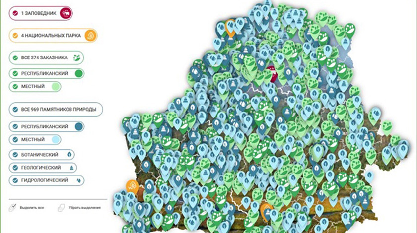 Карта размещена на сайте Минприроды в разделе «Особо охраняемые природные территории Республики Беларусь». Она представляет собой онлайн-ресурс, содержащий информацию обо всех уникальных природных достопримечательностях страны. Впервые в Беларуси создан единый портал, посвященный экологическому туризму, на котором каждый желающий может ознакомиться с объектами природного наследия. Интерактивный продукт содержит фото- и видеоматериалы и описательную информацию о местах обитания исчезающих видов флоры и фауны, редких формах рельефа, чистейших родниках и криницах, живописных старинных парках, красивейших озерах, вековых деревьях и насаждениях, древних валунах и многом другом.