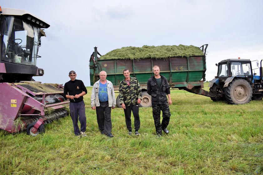 На мінулым тыдні корманарыхтоўка вялася за вёскай Жалудова. Карэспандэнт рэдакцыі папрасілася пад’ехаць на поле з вадзіцелем гаспадаркі Мішам Лазукам, які на «Ніве» развозіў абеды. Здалёк убачылі КВК, на якім працаваў Юрый Літвінаў. Ён падбірае і здрабняе за дзень больш за дзвесце тон травы. Яго калега – Юрый Аўчыннікаў – убіраў травы “напрамую” на суседнім полі. Адвозілі сянаж ад двух КВК механізатары Андрэй Сцяпанаў, Сяргей Скітоў, Аляксандр Рыдачэнка, Сяргей Роганаў. «У залежнасці ад вільготнасці травы ў трактарны прычэп змяшчаецца па 10-13 тон. Гэта ведаем дакладна, бо кожны раз заязджаем на вагі, – расказалі яны. – Зараз возім здробненую траву ў Ляжні, а да гэтага працавалі ў Крывым Сяле і Любічах».