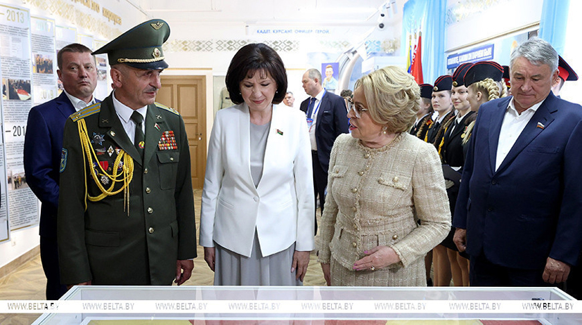 Председатель Совета Республики Национального собрания Республики Беларусь Наталья Кочанова и председатель Совета Федерации Федерального собрания Российской Федерации Валентина Матвиенко приняли участие в торжественной церемонии передачи исторического Знамени Полоцкого кадетского корпуса, с соответствующим сертификатом, подтверждающим факт реставрации знамени во Всероссийском художественном научно-реставрационном центре имени академика И.Э.Грабаря.