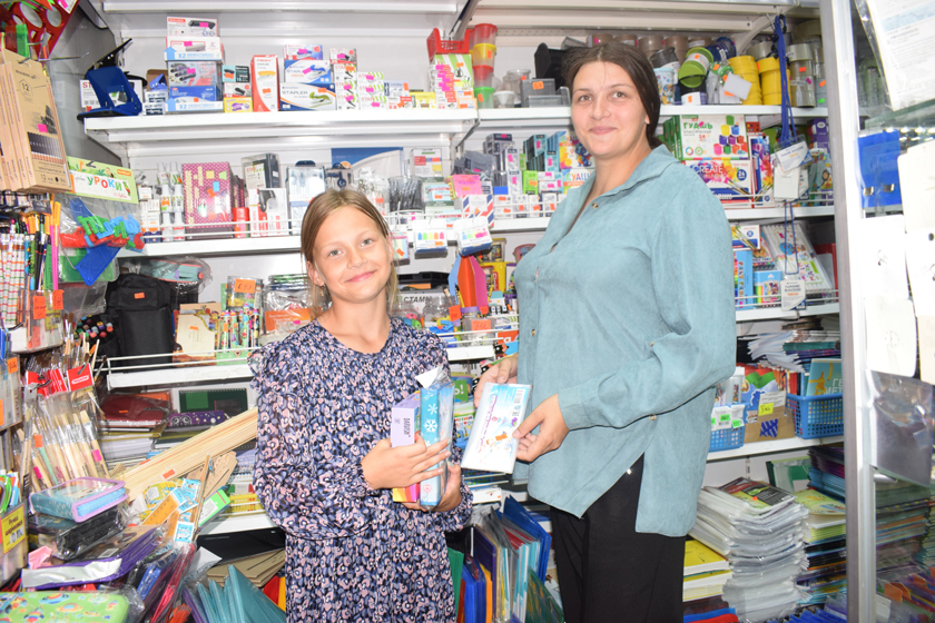 Такую дапамогу атрымала і сям’я Лясняк, якая выхоўвае пецярых дзяцей, сярод іх – трое школьнікаў. Ксенія пой-дзе ў пяты клас, двайняты Арына і Аліса – у першы. На днях мама Ірына Русланаўна з Ксеніяй адправілася ў гандлёвыя аб’ектыі. У магазіне «Чырвоная цана» купілі рукзак і красоўкі, а затым накіраваліся ў «Ёршык» за канцтаварамі, дзе мы і засталі іх за пакупкамі.