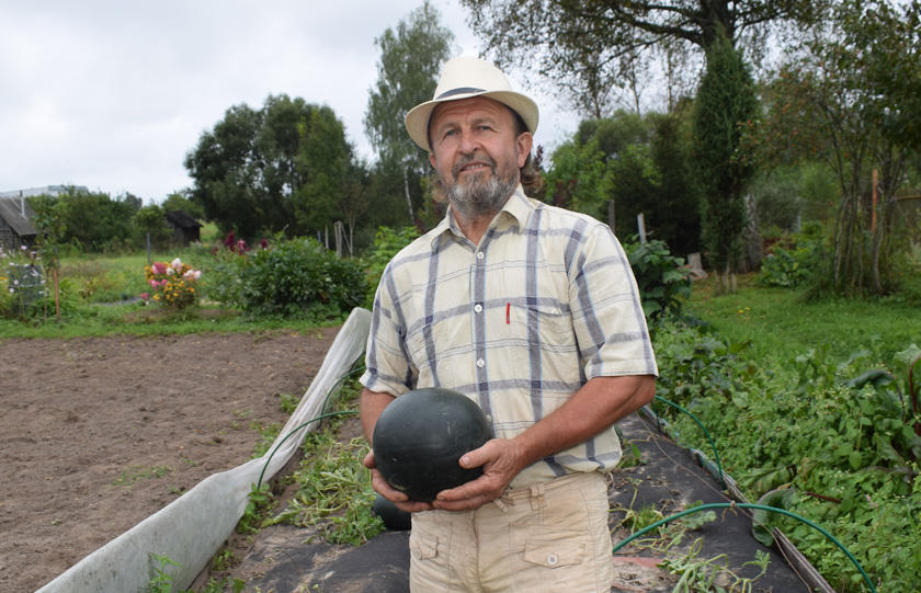 Сяргей Смольскі гасцінна запрашае прайсці на ўчастак за домам, дзе вырошчвае гародніну і садавіну. Адразу звяртаеш увагу на кавуны, якія раскінуліся на градках. На бахчы мы налічылі больш за дваццаць «шарыкаў». Цёмна-зялёныя і паласатыя, яны тут адчуваюць сябе паўнацэннымі гаспадарамі. І толькі Сяргею Уладзіміравічу вядома, колькі сіл і энергіі прыйшлося прыкласці для іх вырошчвання.