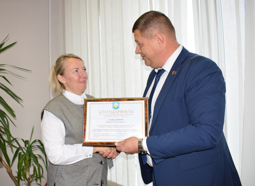Важнасць прафсаюзнага руху ў краіне, у тым ліку і ў нашым раёне, адзначыў старшыня райвыканкама Сяргей Галынчык і ўручыў Наталлі Уладзіміраўне Падзяку старшыні райвыканкама за плённую работу.