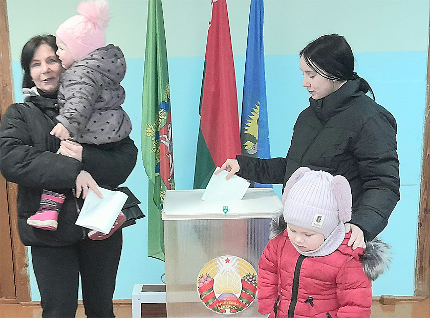 На участки для голосования активно подходят избиратели, чтобы исполнить свой гражданский долг. Алеся Сяргееўна Куранкова з агрогородка Башни прыйшла на выбарчы ўчастак з дачкой і ўнучкамі.