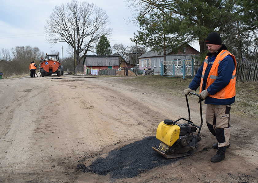 За работай мы заспелі дарожных рабочых Юрыя Італьянцава і Аляксандра Сцепаненку. З рыдлёўкамі ў руках яны разраўнівалі дарожны матэрыял на засыпаных ямінах. Затым прыступіў да работы Сяргей Маркаў — з вібраплітой у руках ён ушчыльняў дарожную сумесь, каб яна добра трымалася. Яміны засыпаюцца аргамінеральнай сумессю.