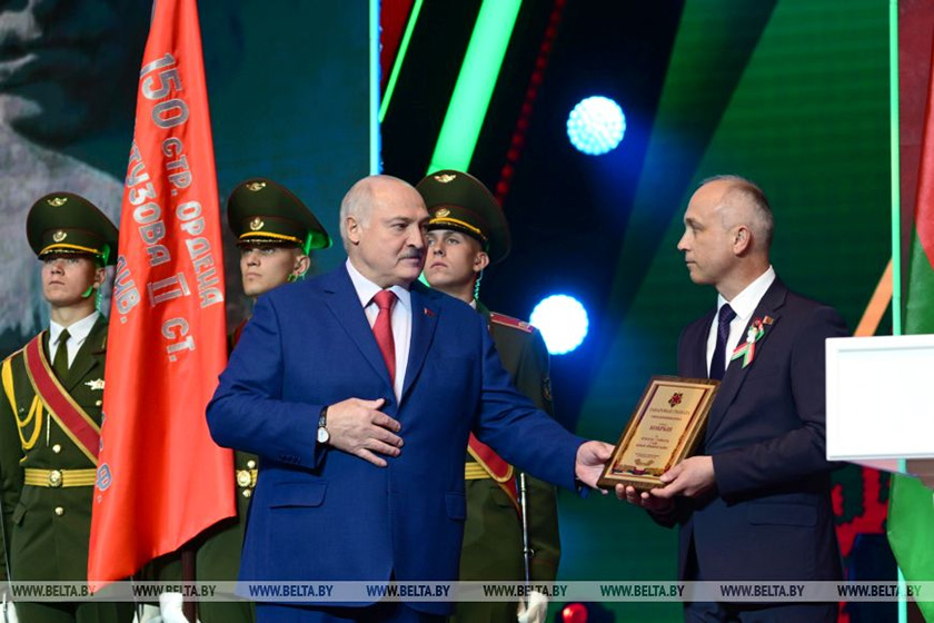 Глава государства вручил вымпелы шести городам Беларуси, которые являются примером подвига и всенародного сопротивления, проявленных в годы Великой Отечественной войны, передав их местным руководителям.