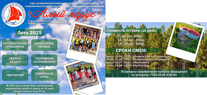 Плануецца, што за чатыры летнія змены (колькасць дзён у змене – 15) у стацыянарным кругласутачным выхаваўча-аздараўленчым лагеры «Пунсовы ветразь» адпачне 275 дзяцей. «Першая змена пройдзе з 3 па 17 чэрвеня, другая – з 23 чэрвеня па 7 ліпеня, трэцяя – з 15 па 29 ліпеня, чацвёртая – з 4 па 18 жніўня, – расказала начальнік лагера Святлана Раманава. – Кожная змена будзе тэматычнай («Планета здаровага ладу жыцця і бяспекі», «Планета патрыётаў», «Экапланета» і «Артпланета»), гэта робіцца для таго, каб дзеці маглі выбраць менавіта тое, чым яны цікавяцца».
