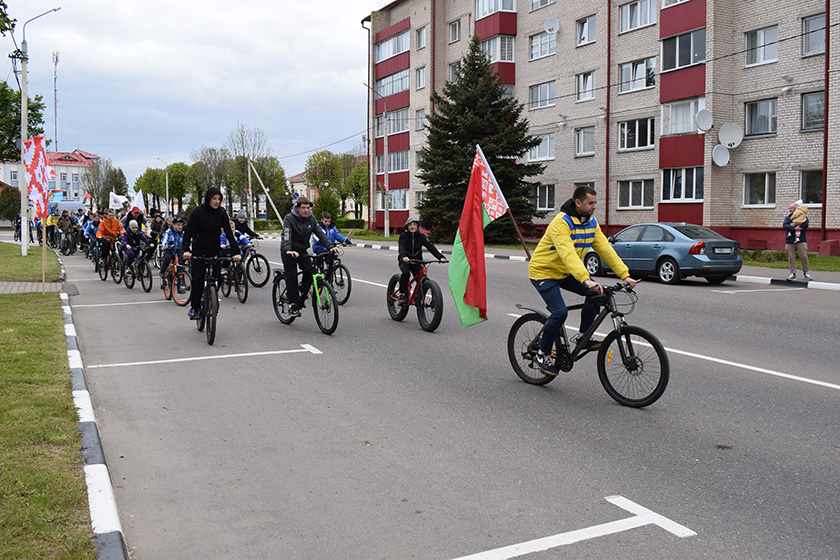 Удзельнікі велапрабегу – прадстаўнікі прадпрыемстваў, грамадскіх арганізацый, устаноў адукацыі раёна – пад сцягам роднай краіны праехалі па вуліцах Кароткіна-Суворава-70 год БССР- Юбілейная-С.Т. Пальвінскай– Хамянкова-Посахава-Сіпко-Мясаедава-Ленінская-Кароткіна.