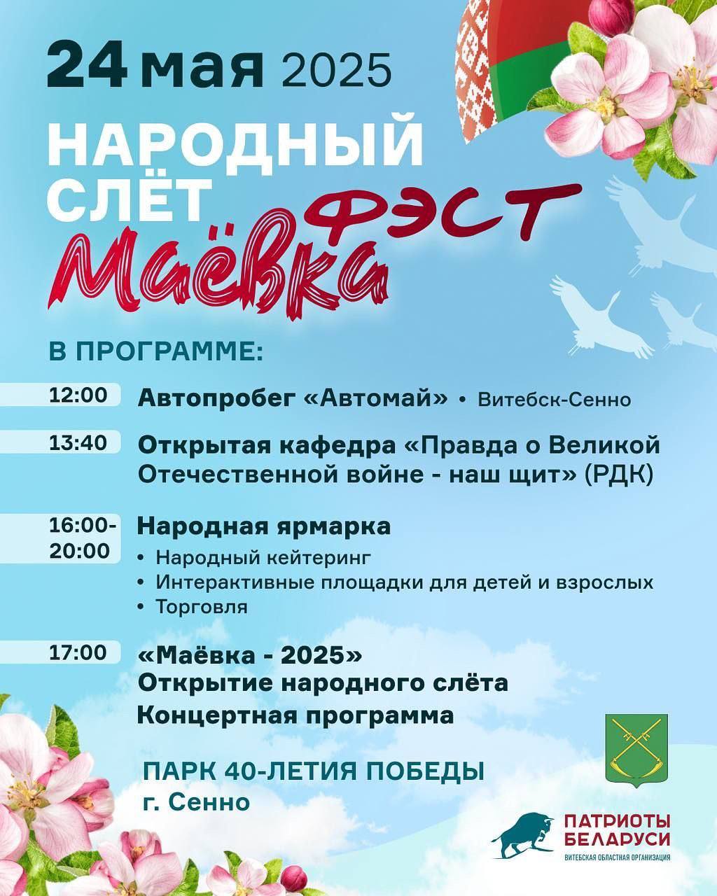 24 мая в г. Сенно впервые пройдет народный слет «Маевка Фест». Парк 40-летия Победы станет площадкой, где каждый найдет развлечение по возрасту и интересам. Здесь развернется ярмарка с народным кейтерингом от казачества Витебской области, автодрифт-шоу, интерактивные площадки, торговля и общепит.