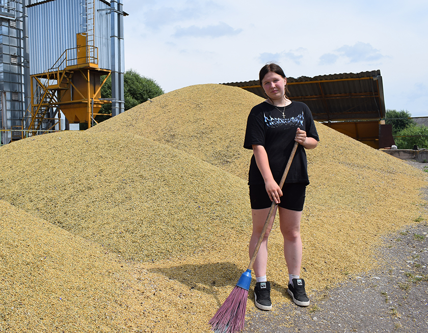 «Уладкавалася на работу на зерняток упершыню. Захацелася паспрабаваць, як гэта – зарабіць уласныя грошы, – расказала 15-гадовая Ніка. – Для мяне тут работа няцяжкая, прывычная, я ж вырасла ў вёсцы. Ды ў мяне ж няпоўны рабочы дзень». Дзяўчына падмятае на зернетаку, прыбірае. Дапамагала дарослым затарваць муку ў мяшкі для жывёлы, агароджу фарбавала. Пажартавала, што яшчэ лічыць бацькавы рэйсы, які са жніўных палеткаў ад камбайнаў прывозіць на трактары азімы ячмень.