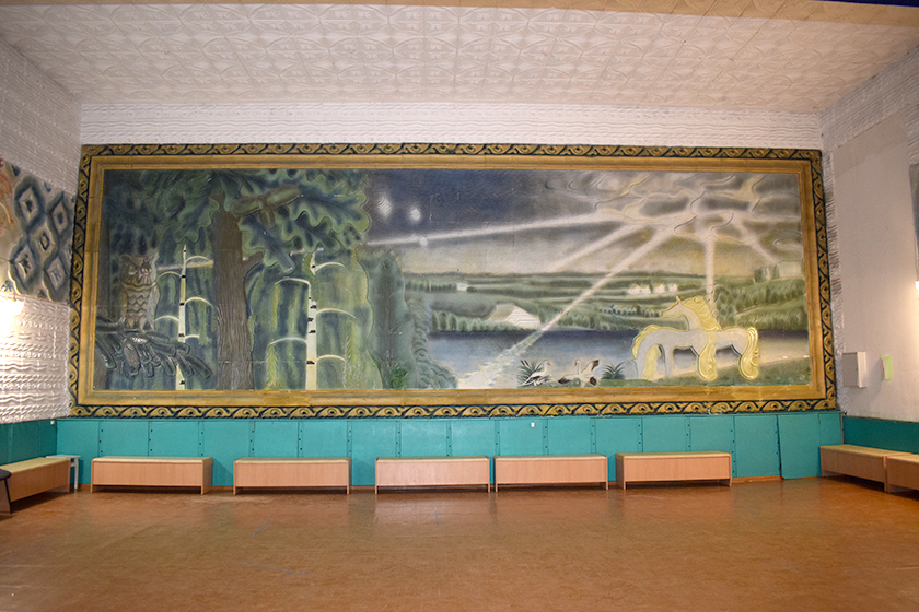 У танцавальнай зале Амбросавіцкага сельскага клуба. Шырыня карціны 11 метраў, вышыня – каля чатырох. Нашы чытачы прасілі расказаць, чыімі рукамі створаны гэты твор.