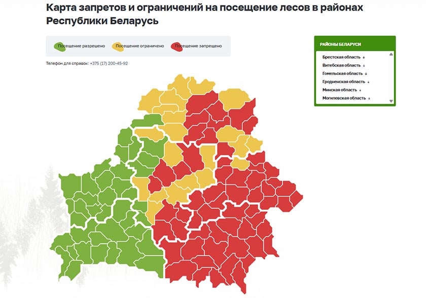 В большинстве районов Беларуси введены запреты и ограничения на посещение лесов. Об этом свидетельствуют данные интерактивной карты на официальном сайте Министерства лесного хозяйства Беларуси