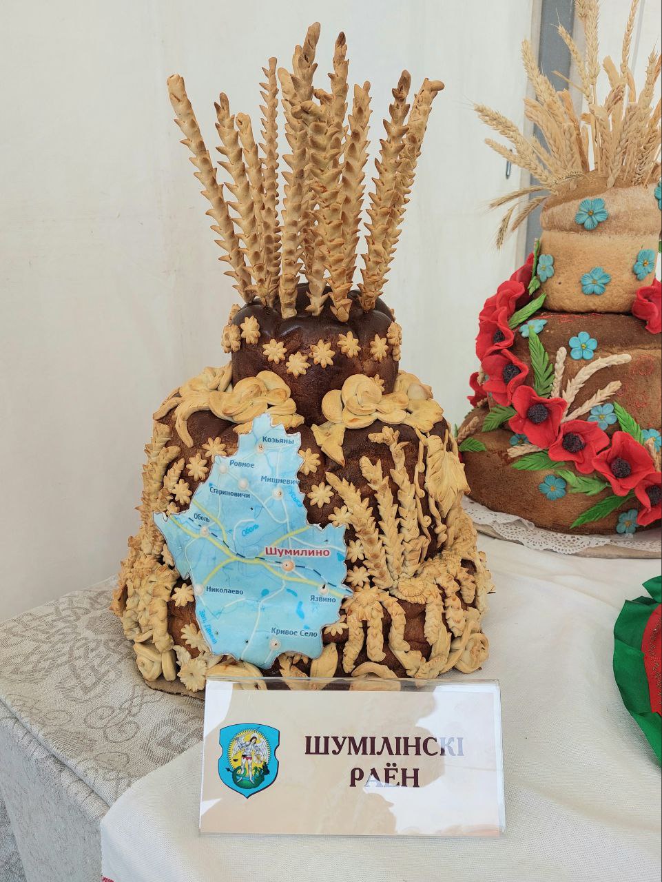 Асобнае месца на свяце занялі дзве важныя сімвалічныя выставы – дажыначныя караваі і снапы раёнаў Віцебшчыны. Сноп Шумілінскага раёна – справа рук нашага вядомага таленавітага майстра Дома рамёстваў Наталлі Сцержанковай. «Я – за традыцыі, натуральнасць, без штучных дабавак. Набойку на льне дапамагла зрабіць калега Вольга Загвоздава, – падзялілася Наталля. – Сноп атрымаўся вытрыманым у класічным стылі. На яго выраб пайшло два тыдні».