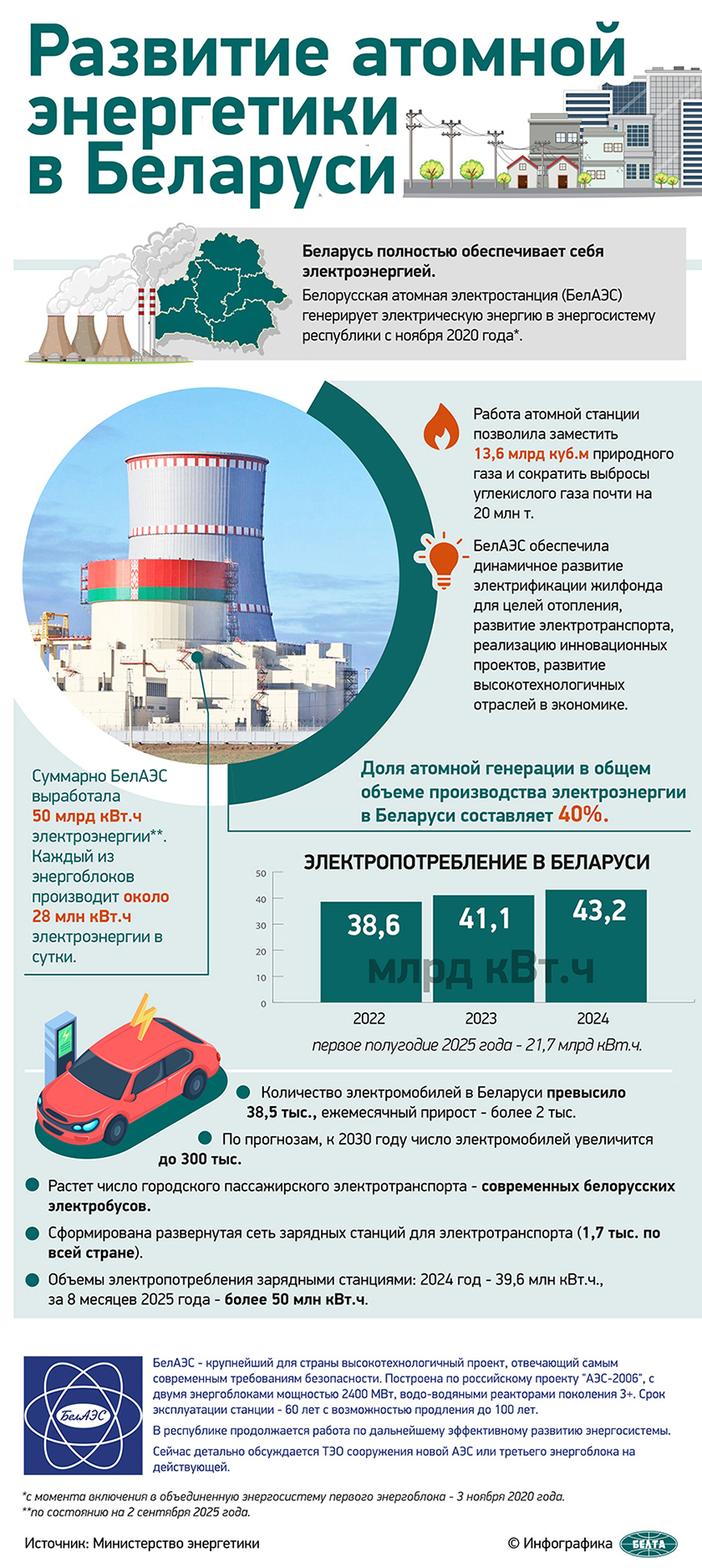 Кроме того, атомная станция кардинально изменила облик белорусской энергетики. В рамках интеграции БелАЭС в энергосистему реализована масштабная программа модернизации электросетей — реконструировано более 1,7 тыс. км, построены современные подстанции, внедрены прорывные цифровые технологии, повышающие надежность электроснабжения потребителей.