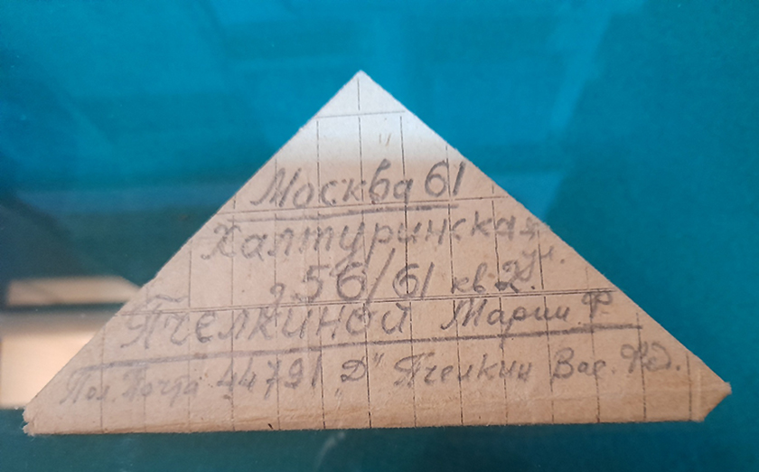 На пажаўцелым ад часу і крыху пацёртым трохкутнічку чытаем: палявая пошта 44791 “Д”, Масква, вул. Халтурынская, д. 56/61, кв. 2, Пчолкінай Марыі Ф.