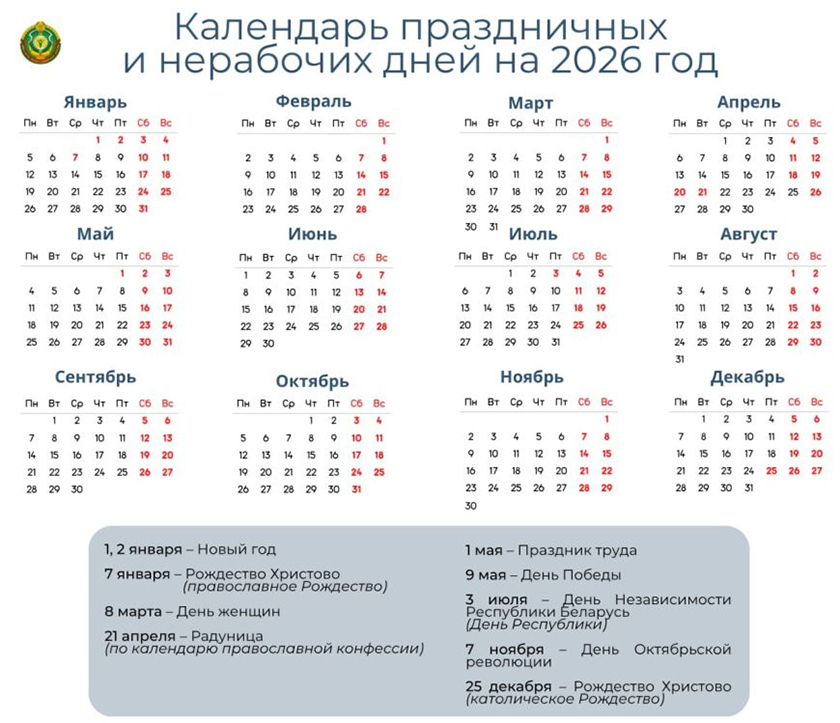 В какие дни в 2026 году белорусы будут официально отдыхать, БЕЛТА рассказали в Министерстве труда и социальной защиты.