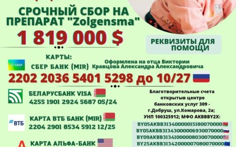 Продолжить чтениеМы, Кравцова Наталья Викторовна и Кравцов Александр Александрович, проживающие в РБ, г.Добруш, просим Вас о помощи. У нашей дочери Кравцовой Виктории Александровны (20.04.2021г.р) в 1 год и 4 месяца диагностировали редкое генетическое заболевание — спинальная мышечная атрофия второго типа. С каждым днем болезнь забирает силы у нашей дочери. Нарастает слабость во всех мышцах тела. Со […]