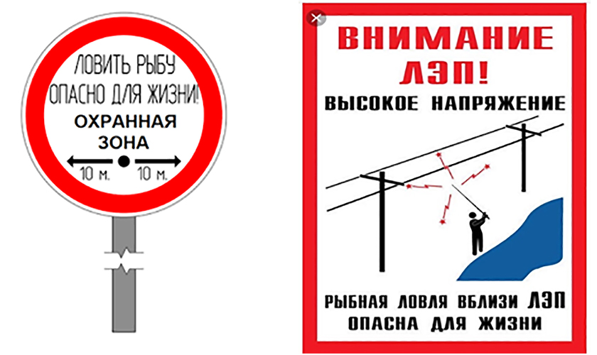 В местах пересечения воздушных линий электропередачи с озерами и реками, а также расположения воздушных линий электропередачи вдоль береговых линий озер, рек и крупных мелиоративных каналов (при наличии возможности прикосновения или приближения удилищем к проводам воздушной линии электропередачи) должны быть установлены знаки и плакаты, запрещающие рыбную ловлю: «Ловить рыбу опасно для жизни. Охранная зона 10 м», «Внимание ЛЭП!» «Рыбалка запрещена!» и т.п.