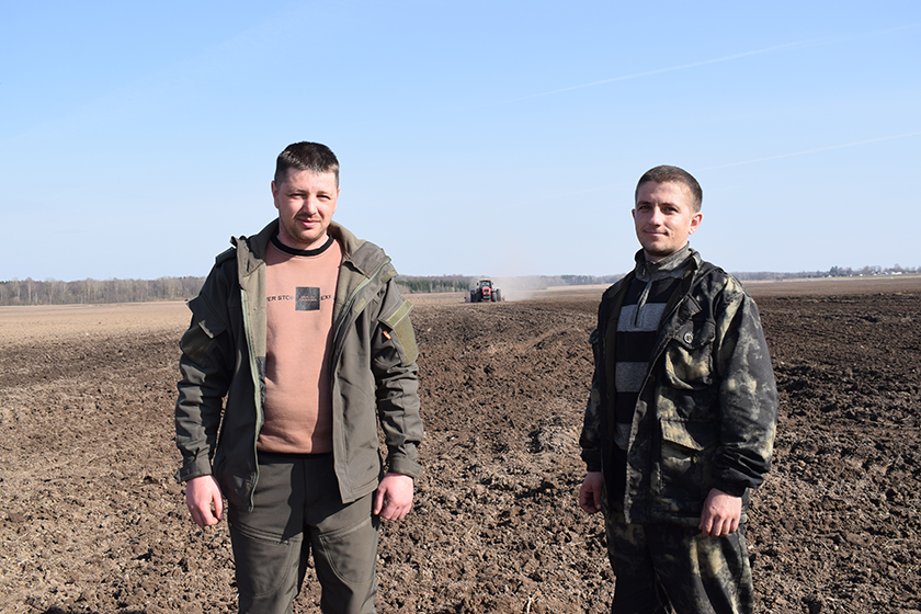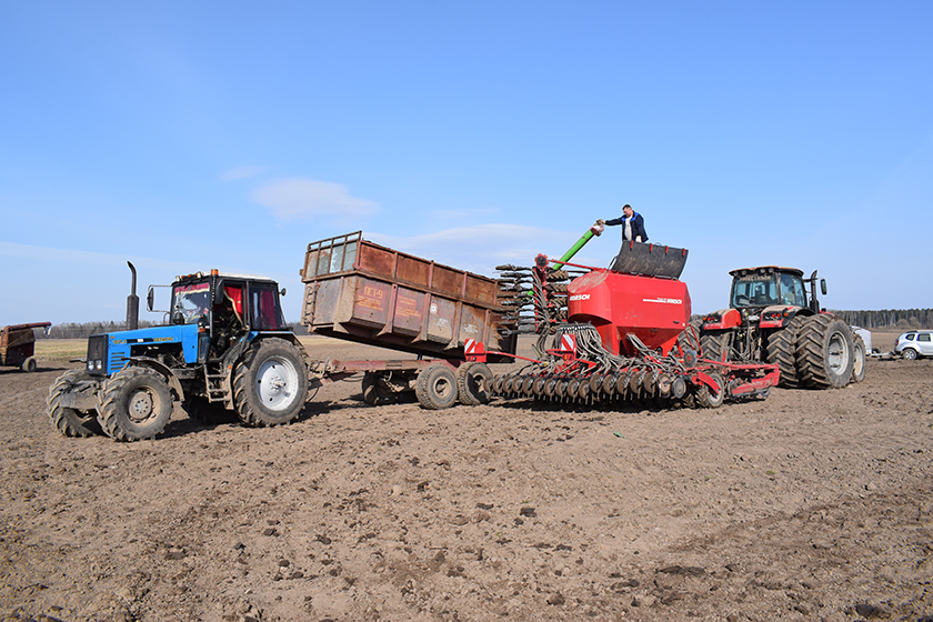 Пакуль тэхніка з пасяўным агрэгатам рухаецца з далёкага краю поля, размаўляем з шумілінцамі, якія рупяцца тут – механізатарам Вадзімам Гарланавым і вядучым аграномам Уладзіславам Осіпавым. Вадзім падвозіць сеяльшчыку суперэлітнае насенне: авёс “квант” і райграс “гусляр”, а Уладзіслаў кантралюе працэс сяўбы, пры неабходнасці дастаўляе паліва ці запчасткі.