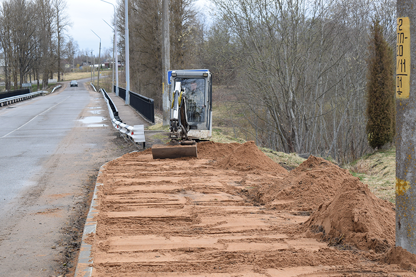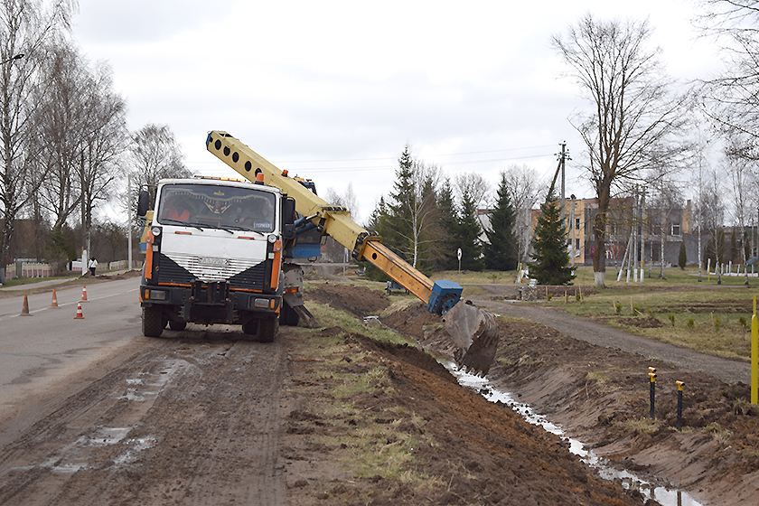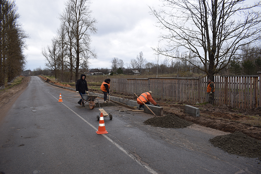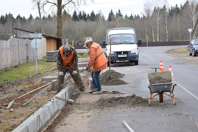 Брыгада дарожнікаў працавала таксама і на ўчастку дарогі ад вуліцы Вышалескага да моста праз рэчку – устанаўлівалі бардзюры для пешаходнай дарожкі. Праз дарогу была бачная работа брыгады лясгаса, якая папрацавала з піламі тут напярэдадні, – ляжалі зрэзаныя старыя дрэвы.