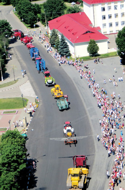 А на плошчы – парад тэхнікі, які з асаблівым нецярпеннем чакалі дзеці. Дзе яшчэ ўбачыш адразу столькі трактароў, машын, камбайнаў, сеялак і розных спецыялізаваных машын! Магутныя МАЗы, КЗРы, энерганасычаныя трактары адзін за адным праязджаюць перад гледачамі. Такая сучасная тэхніка працуе сёння на палях Шуміліншчыны.