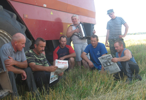 І пра агранома, і пра хлеб, і пра родную зямлю, і пра каханне спявала песні пад акампанемент баяна Л. А. Догель. А мясцовы бібліятэкар прывезла прама на поле свежыя газеты і часопісы. Механізатары ўзялі ў рукі перш за ўсё “Герой працы” – у першую чаргу пацікавіцца, як ідзе жніво ў іншых гаспадарках раёна, хто ў перадавіках.