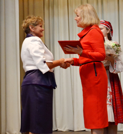 Л. М. Сцяпанаў уручыў ганаровыя граматы абласнога ўпраўлення адукацыі былому начальніку аддзела адукацыі, спорту і турызму П. У. Спірыдонаву, настаўніку беларускай мовы і літаратуры Язвінскай д/с-БШ Н. А. Каротчанка, выхавальніку Светласельскага ясляў-сада А. В. Гарлачовай.