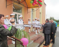 Пад дроб, якую адбівалі прыгожыя барабаншчыцы, шаноўныя госці пераразаюць чырвоную стужку. Услед за дырэктарам школы, якая нібы адчыніла дзверы сімвалічным ключом, прысутныя ўвайшлі ў школу.