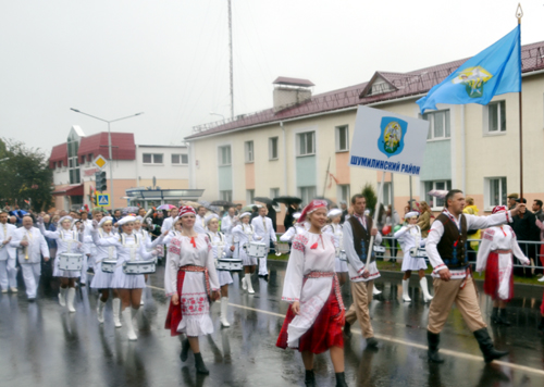 Калона нашага раёна замыкала шэсце, яна выглядала адметна, бо белыя з золатам касцюмы нашых музыкантаў і барабаншчыц у пахмурны дзень радавалі асаблівай святочнасцю.
