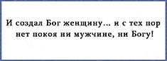 Усе маўчалі. Гасподзь забраў у іх жонак, перамяшаў іх, а потым раздаў, каму якая трапілася. З тае пары дзевяць мужчын з дзесяці думаюць, што чужая жонка саладзей, таму што яна з’ела лішні кавалак цукру.
