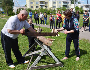 Падчас конкурснага задання “За дровамі” мужу і жонцы трэба было на хуткасць двухручнай пілой распілаваць бервяно на дзве часткі, пакалоць і скласці дровы.