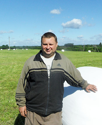 Алег Мікалаевіч працуе з дыскавай касілкай, за дзень перавыконвае даведзены план у два разы: скошвае па 12-14 гектараў. Падвяленую траву зграбаюць у валкі Анатоль Чэклін і Аляксандр Склярэнка. Затым прыступае да работы Алег Валер’евіч. У яго новы рулонны прэс-падборшчык, які ўпакоўвае сянаж у стрэйч-плёнку. Дарэчы, адзіны ў нашым раёне. З дапамогай гэтай тэхнікі трава збіраецца, прасуецца і ўкручваецца ў стрэйч-плёнку. І на скошаным полі адзін за адным з’яўляюцца беласнежна-серабрыстыя рулоны. Яны ствараюць сенажаці прывабна-святочны выгляд. Мы паспрабавалі скрануць з месца адзін з рулонаў – ідэальна роўны і шчыльны. “Не старайцеся, адзін рулон важыць пяцьсот кілаграмаў, – усміхнуўся механізатар. – Большую вагу зрабіць не дазваляе камп’ютар, устаноўлены ў кабіне трактара. Усяго за дзень атрымліваецца да двухсот рулонаў – у залежнасці ад ураджайнасці травы”.