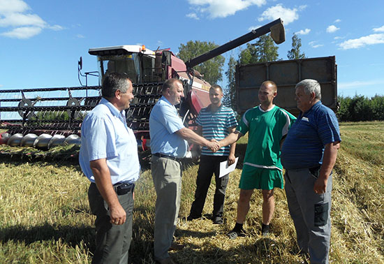 Павіншаваць лідараў жніва на поле прыехалі в. а. старшыні райвыканкама начальнік райсельгасхарчу В. Ц. Мянькоў, старшыня райкама прафсаюза работнікаў АПК А. В. Аляксеенка, кіраўнікі і аграномы гаспадарак. Ад райкама прафсаюза экіпажам тысячнікаў былі ўручаны падзячныя лісты і грашовыя прэміі.