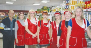 Павялічваючы штомесяц аб’ёмы тавараабароту, плённа працуюць (на здымку справа налева): загадчыца магазіна Святлана Клімантовіч і прадаўцы Алена Бараноўская, Юлія Сокалава, Аксана Булах, Наталля Рагожкіна, Іна Ціханава, дапамагае ім рабочы Вячаслаў Зуеў .