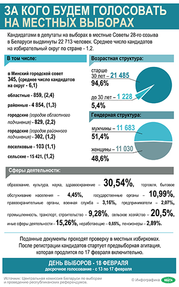 Выборы в местные Советы депутатов пройдут в Беларуси 18 февраля, проголосовать досрочно можно будет с 13 по 17 февраля. Регистрация кандидатов завершилась 18 января. Сразу после регистрации кандидаты могут приступать к агитации: выступать в СМИ, проводить митинги и пикеты, знакомить избирателей со своими программами.