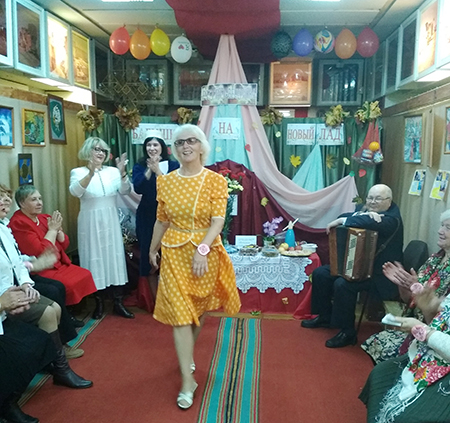 І думаеце, куды ідуць гэтыя жанчыны ў рэтра сукенках і капялюшыках? Яны ідуць на рэтра-вечарынку. Так ім захацелася. І гэта жаданне падтрымалі і дырэктар Шумілінскага гісторыка-краязнаўчага музея Святлана Іванова, і старшыня раённай ветэранскай арганізацыі Таццяна Цэрах.