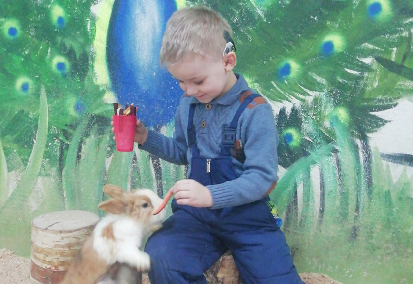 В 2 годика Максиму установили кохлеарный имплант. С тех пор с ним постоянно занимаются родители и сурдопедагоги, но несмотря на усиленные занятия, прогресса в его речевом развитии и слуховом восприятии по-прежнему нет.