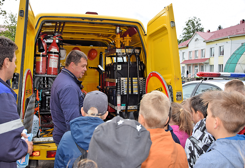 Работнікі газавай службы знаёмілі з камплектацыяй машыны аварыйнай газавай службы. Дзеці з задавальненнем прымяралі маскі, каскі, дыэлектрычныя боты, выказвалі жаданне патрымаць у руках паветрадуўку.