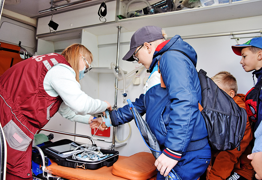 Чым укамлектавана машына хуткай дапамогі, што такое мяшок Амбу, як выглядаюць шыны і супрацьчумны касцюм, паказвала старшы фельчар аддзялення хуткай медыцынскай дапамогі ЦРБ Аліна Шайкіна.