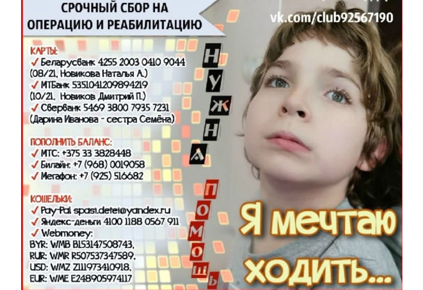 Пока, с помощью добрых людей, нам удалось собрать только третью часть суммы. Также, дополнительно, мы еще собираем деньги на реабилитации Семёна, без которых ему тоже никак не обойтись. Качественная реабилитация (разработка) потребуется и после операции.